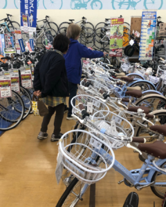 子供たちの写真は掲載できませんが、会員さんたちが子供たちの希望とする色やサイズをもとに自転車を探している写真をご紹介しました